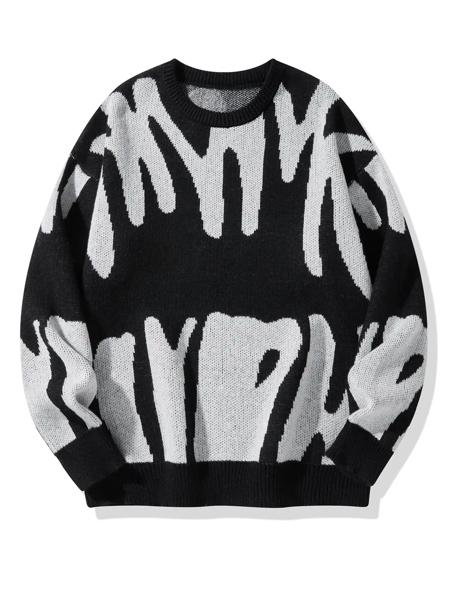 新しい人気の秋冬不規則なジャカードパターンプルオーバーセーターカジュアルラウンドネックコントラストカラーニットメンズプルオーバー