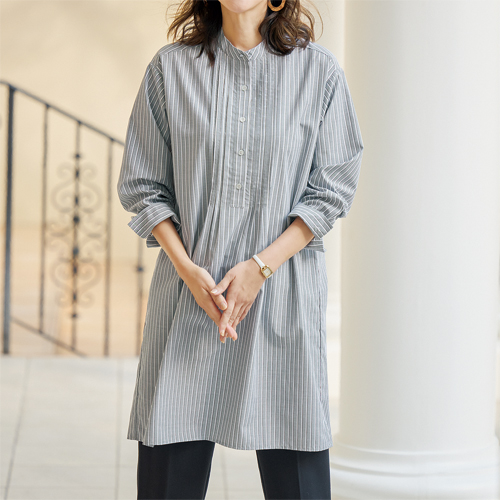 ピンタックデザインストライプシャツチュニック グレー チュニック ブラウス 長袖 レディース 婦人服 ミセス シニア 女性 バンドカラー シャツ 縞模様 縞柄 シンプル おしゃれ シニアファッション 40代 50代 60代 70代 80代 90代 母の日 お母さん おばあちゃん 春物 夏物 春夏