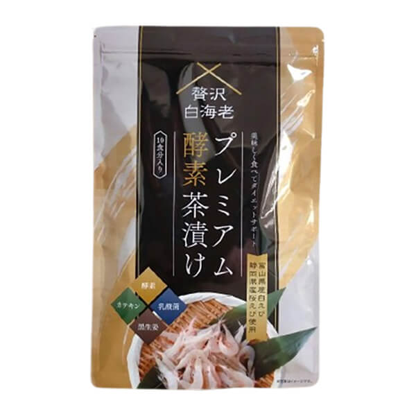 贅沢白海老 プレミアム酵素茶漬けはこだわり抜いたプレミアムなお茶漬け 「酵素」入りでも美味しく、満足感のある一杯に仕上がるよう、素材選びにこだわりました。お湯をかけるだけで贅沢な味わいを堪能できます。