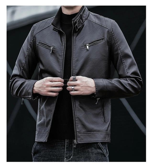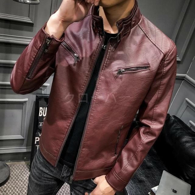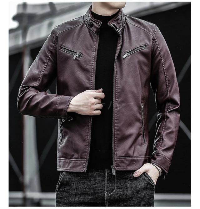 スタンドカラーの合成PUレザー、クラシックでありながらも、防風、保温機能が高く、深まり行く秋と冬に最適レザーなジャケット!