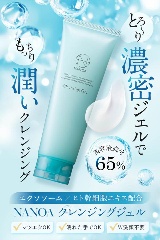 ◆ 「とろーり濃密ジェルでもっちり潤いクレンジング」 ナノアクレンジングジェルは、乾燥や刺激などが気になるけどメイク落ちの良いクレンジングジェルを使いたい。研究開発を重ねて誕生した高機能クレンジングジェルです。話題の整肌成分「ヒト幹細胞培養液」「エクソソーム」を贅沢に配合しています。