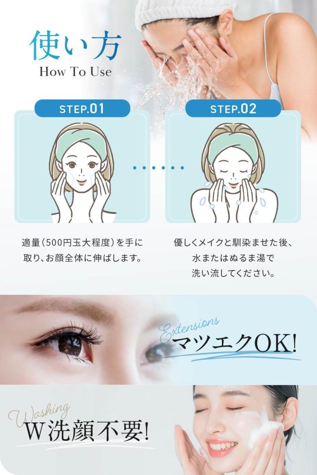 ◆ 【使い方】1:適量を手に取り、お顔全体に伸ばします。 2:メイクと馴染ませた後、水またはぬるま湯で洗い流してください。