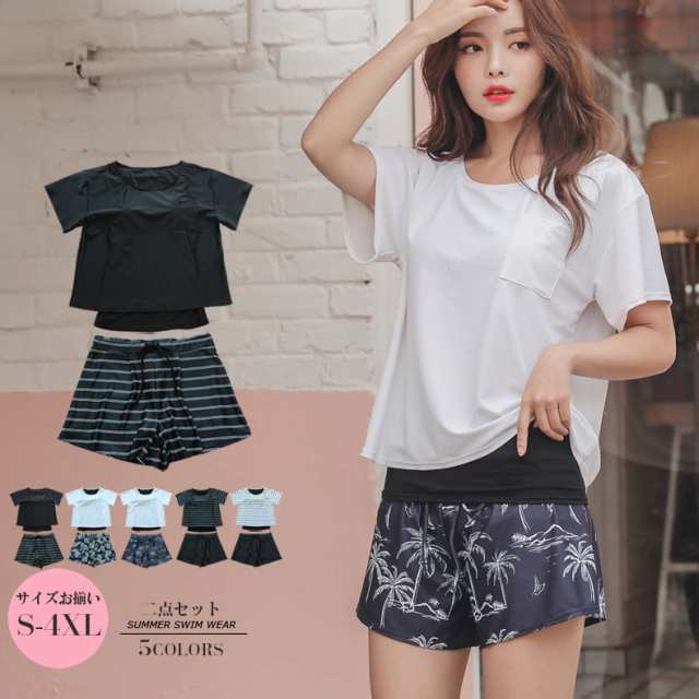 上下2点セットパンツ型水着セット セパレート水着 水着 レディース ラッシュガード セット ショートパンツ 体型カバー 2枚重ね着風Tシャツと見せパンづきショーツは体型カバー完璧?