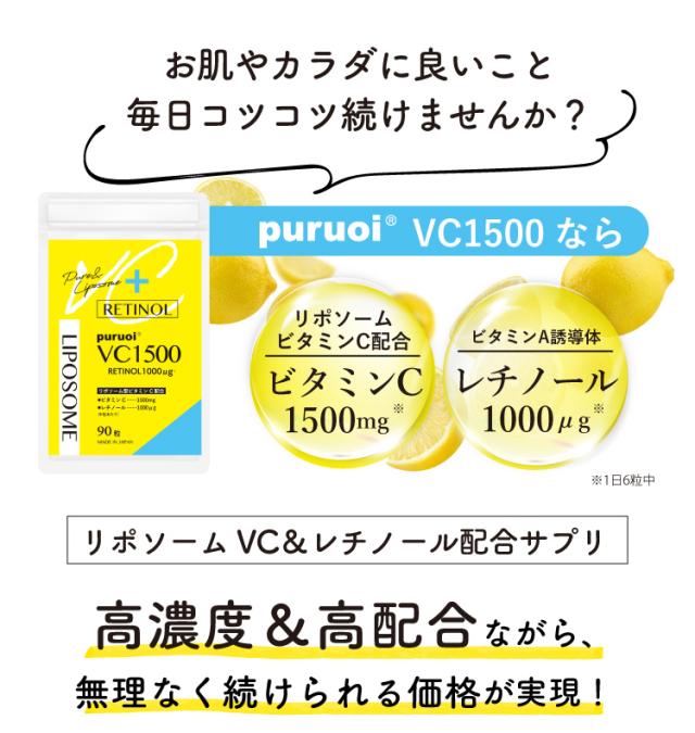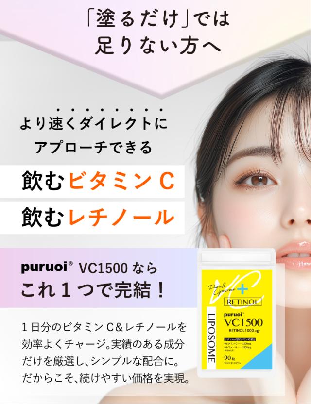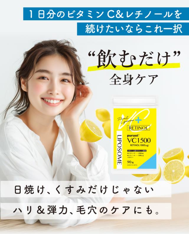 リポソーム ビタミンC & レチノール 配合 プルオイVC1500(90粒入) ビタミン リポソーム レチノール サプリ サプリメント 錠剤 日本製 ぷるおう プルオウ 飲むレチノール