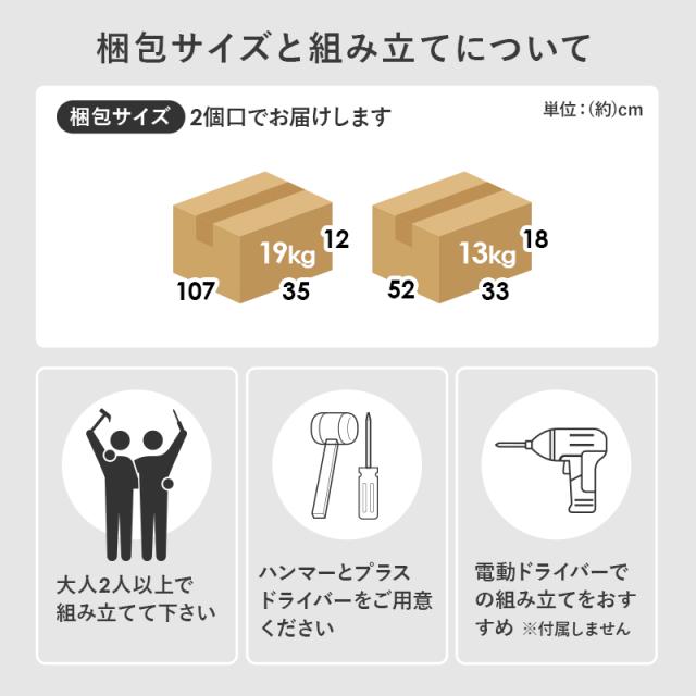 梱包(2個口):107 x 35 x 12cm(19kg)・52 x 33 x 18cm(13kg)