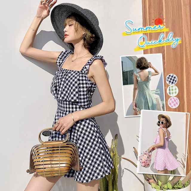 水着 レディース ワンピース水着 体型カバー チェック柄 フレア 日焼け防止 おしゃれ ママ水着 セクシー スイムウェア 可愛い