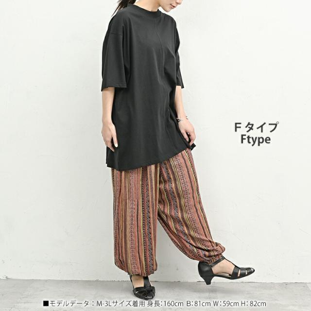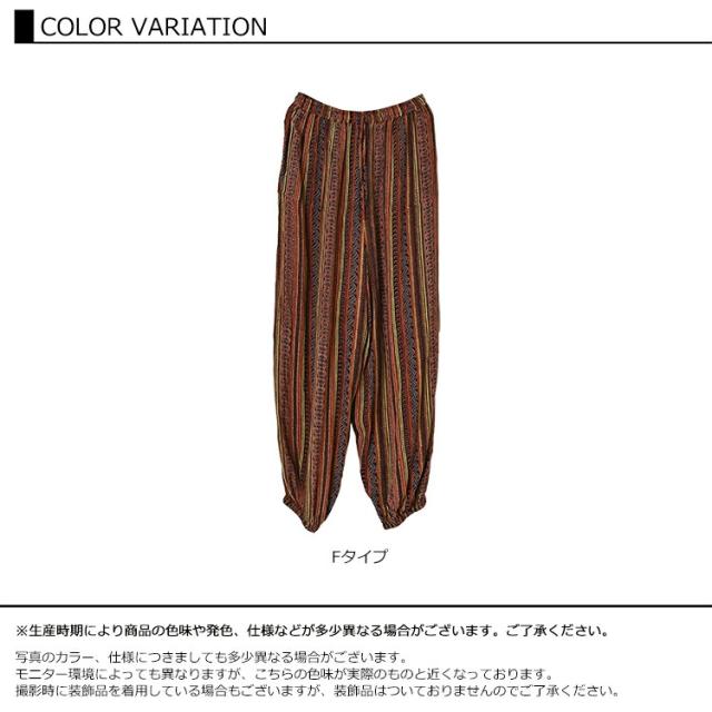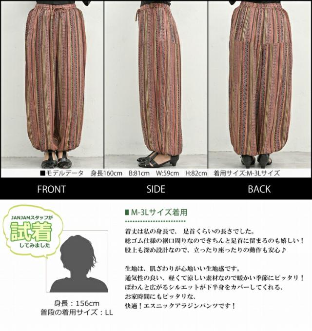 ゆったりリラックス感のある エスニック柄アラジンパンツ。 ウエストがゴム仕様なので 窮屈感なく楽に穿けるのがポイント。 ふんわりシルエットで 気になるヒップや太ももを カバーできるボトムスです。 |