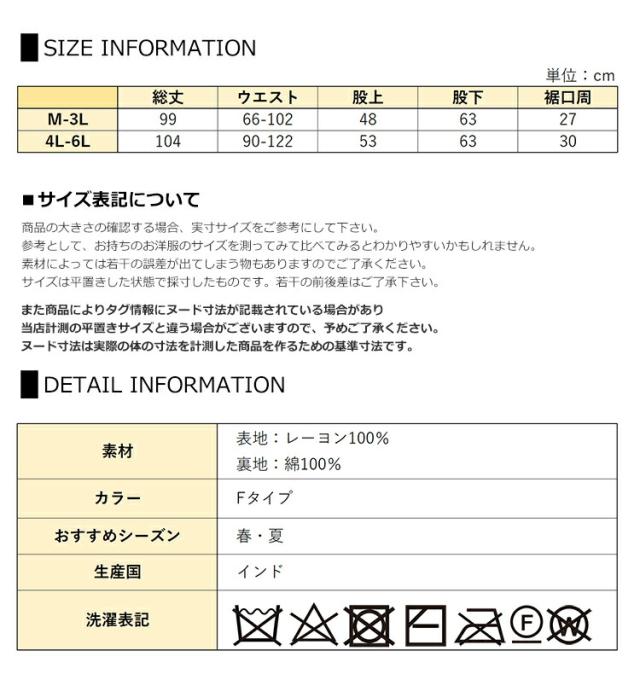4L-6L:総丈104 ウエスト90-122 股上53 股下63 裾口周30