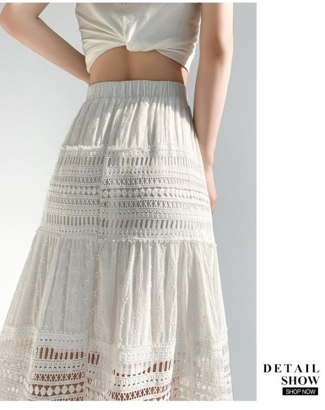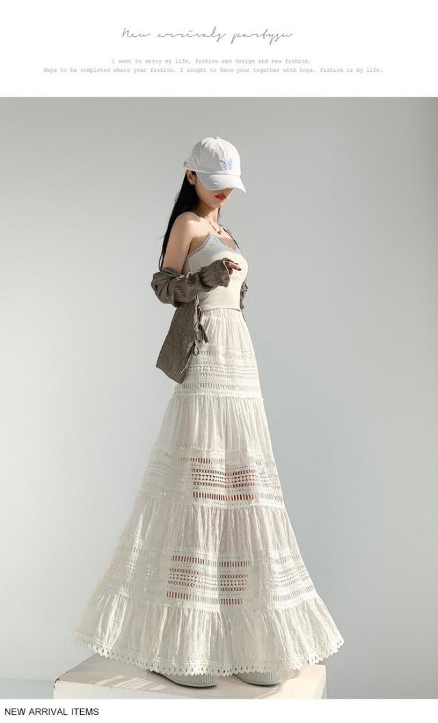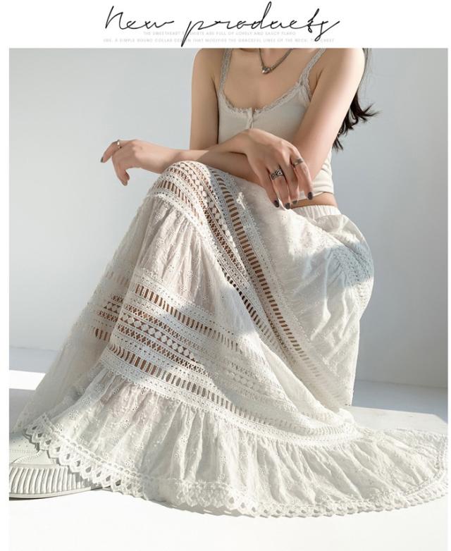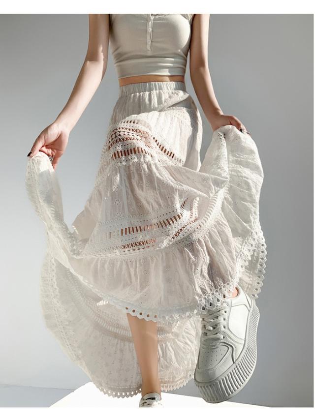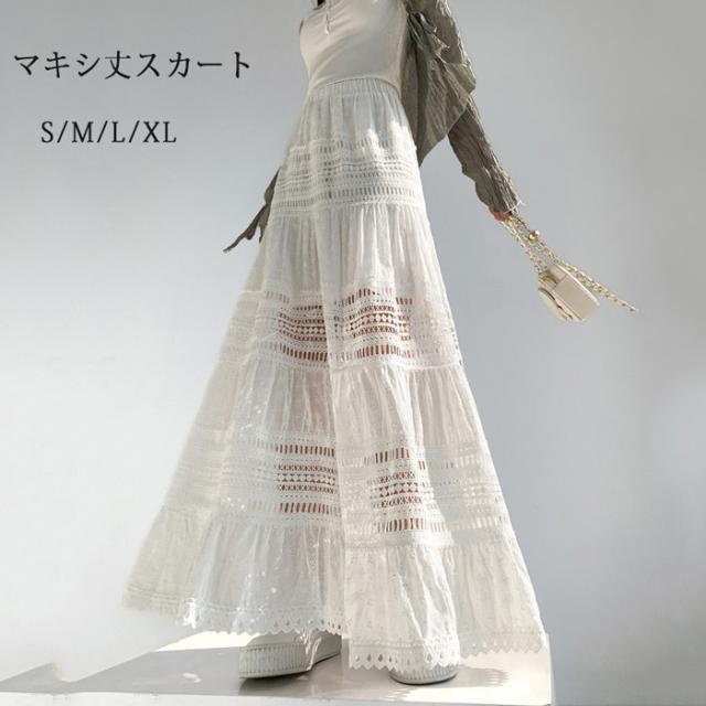 マキシ丈スカート 総レース Aライン 大人 カジュアル 春夏 透け感 きれいめ レディース 透かし編み 涼しい ゆったり ゴムウエスト リゾート ロングスカート 海 サマー ビーチ 20代 30代 40代 ナチュラル ホワイト 白 S M L XL dg122zbzbm6