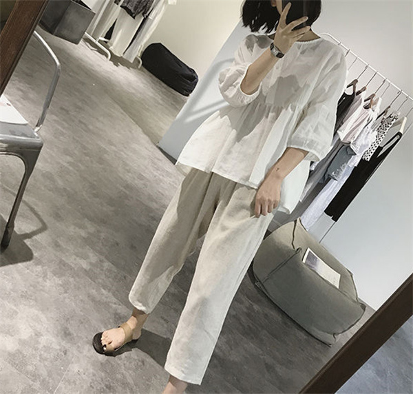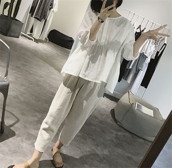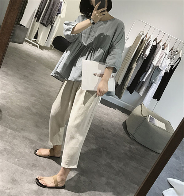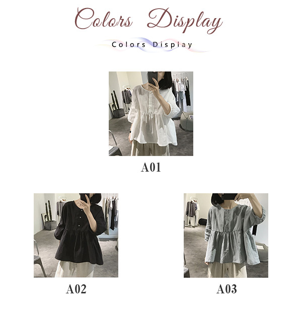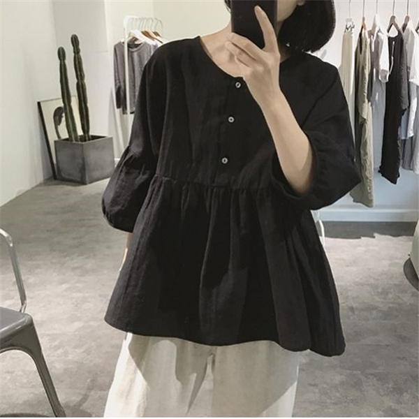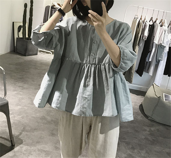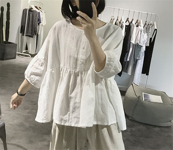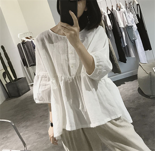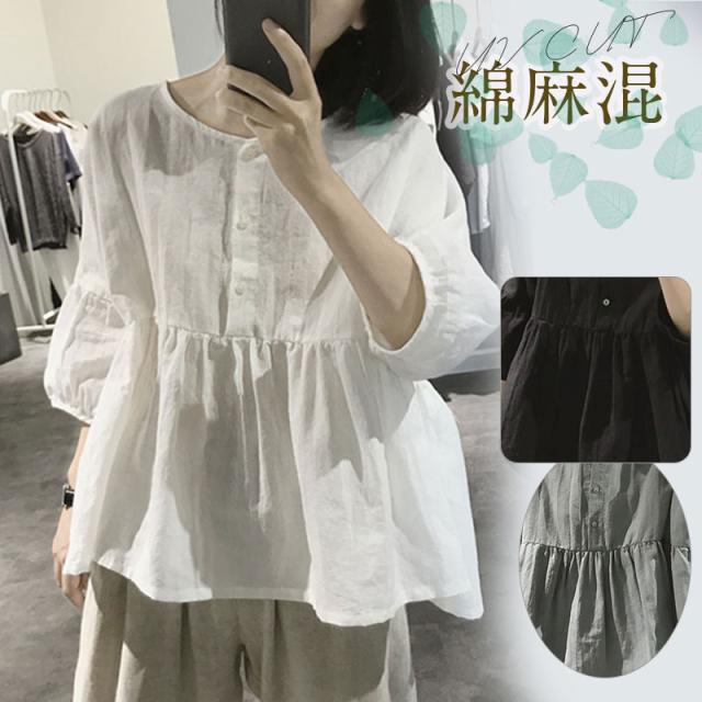 【キーワード】シャツ 綿麻ブラウス レディース 綿麻 プルオーバー 丸首 トップス 無地 体型カバー ゆったり 大きいサイズ ボリューム袖 夏