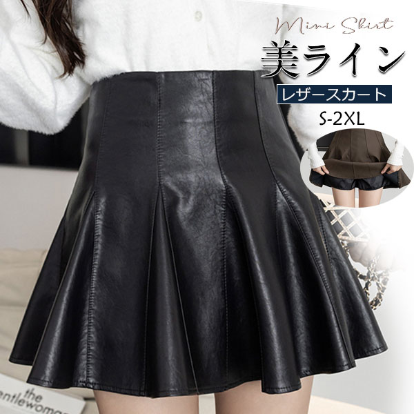 スカート レディース ミニスカート 革スカート PU プリーツ フェイクレザー フレアスカート ボトムス Aライン 体型カバー 大きいサイズ