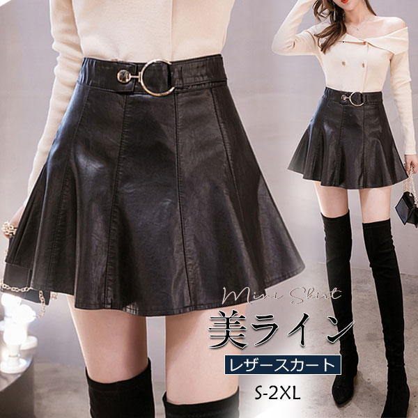 スカート レディース ミニスカート 革スカート PU プリーツ フェイクレザー フレアスカート ボトムス Aライン 体型カバー 大きいサイズ