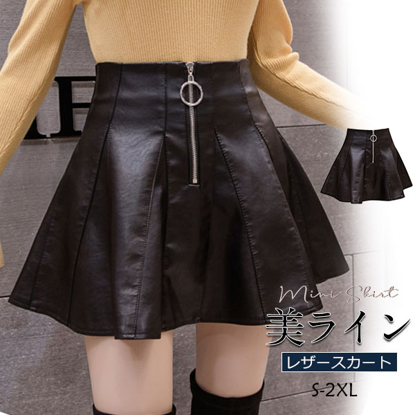スカート レディース ミニスカート 革スカート PU プリーツ フェイクレザー フレアスカート ボトムス Aライン 体型カバー 大きいサイズ