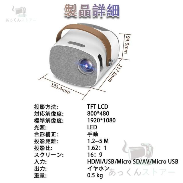 ミニプロジェクターは13.3*11.8*9.5cmのコンパクトな設計で、重量は0.5KGで、どこにでも持ち運ぶことができます。