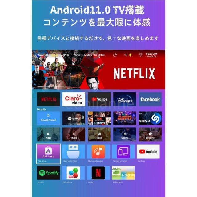 F506プロジェクターはAndroidTV 11.0システムとAllwinner H713スマートチップが内臓されて、1GB + 8GB ROMメモリ搭載し、Wi-Fiと接続した後でインストールされたアプリからお好きな映画、TV番組アニメを鑑賞することができます。YouTubeなどの豊富な映画やビデオを大画面で楽しめます。そのほか、ご需要に応じて一部のアプリをイダウンロードできます。高価な外部ディスプレーデバイスを買わなくてもご自宅にお気に入りのコンテンツが見られます。