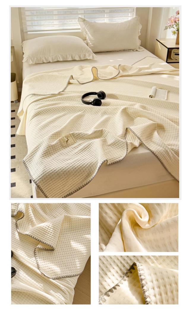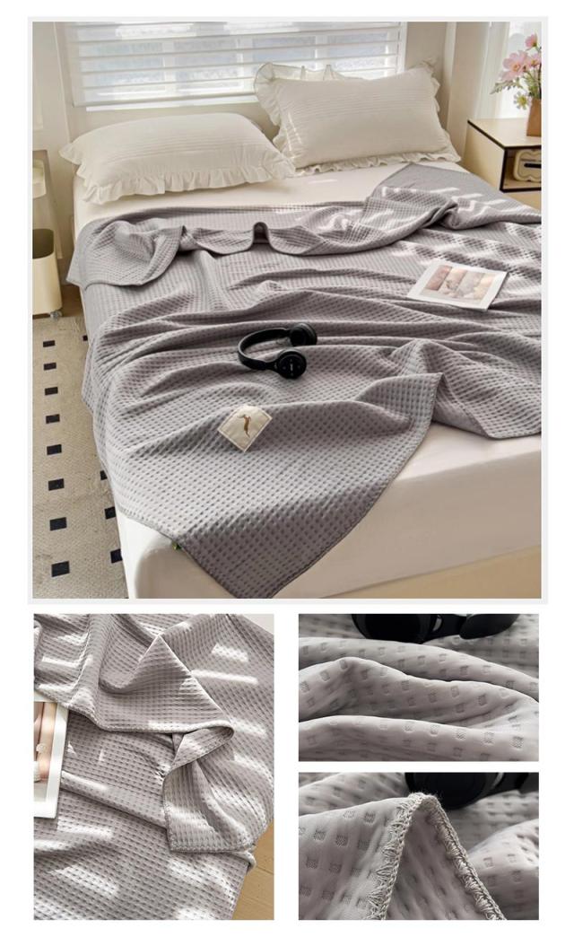 タオルケット ソファカバーとしても。通気性の良いワッフル織りワッフルケット。しっかりした質感のワッフルケット。寒い時はひざ掛けやブランケットとしておすすめです。