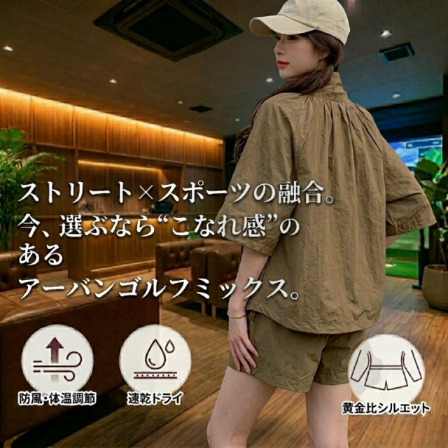 従来のタイトなウェアとは一線を画す、ゆったりとしたトレンドのシルエットで、コースからそのままカフェへ行ける「こなれ感」を演出します。