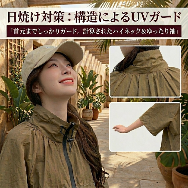 構造によるUV対策: 首後ろの日焼けを防ぐ計算されたハイネック仕様。