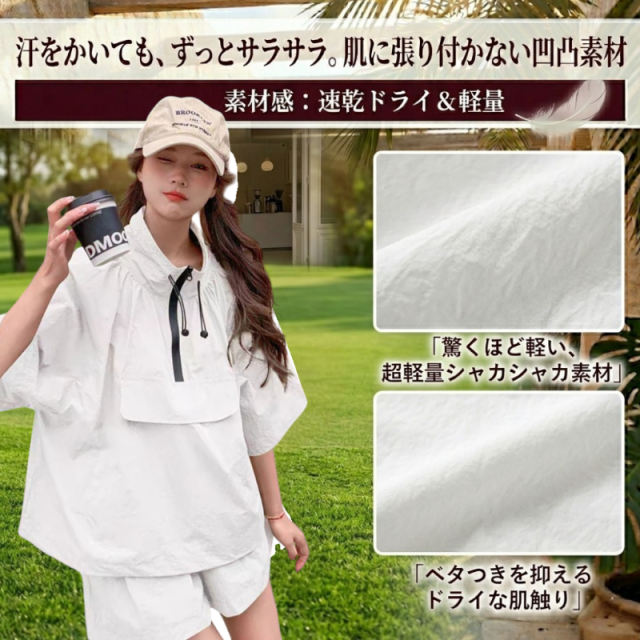 驚きの速乾ドライ: 汗をかいても肌に張り付かない凹凸感のある素材を採用。