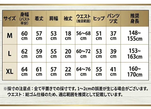 推奨身長について: M/L/XLの3サイズ展開で、推奨身長は最大170cmまで対応。身幅に十分なゆとりがあるため、丈感を基準にお選びいただくのがおすすめです。