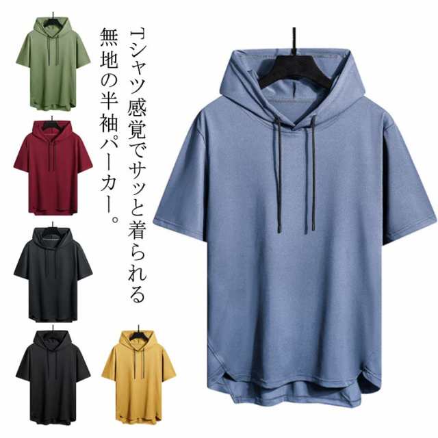 パーカー メンズ 半袖 プルパーカ 薄手 フード付き ゆったり カジュアル 部屋着 ルームウェア 大きいサイズ 夏 無地 全6色