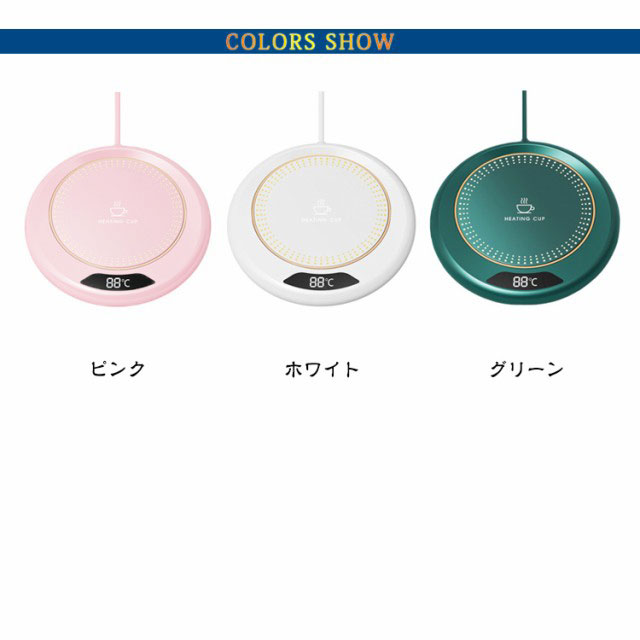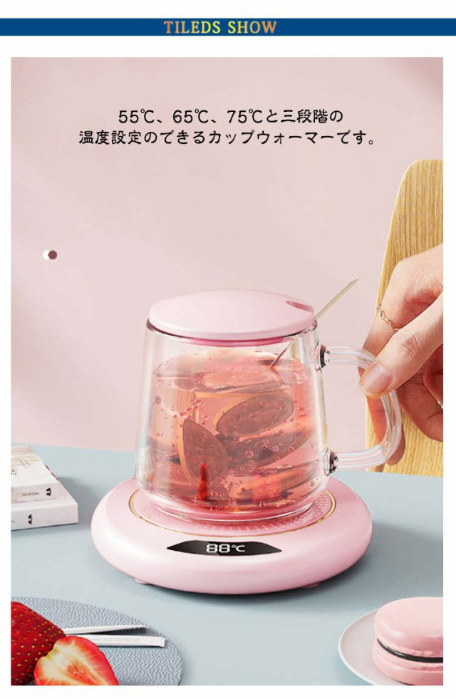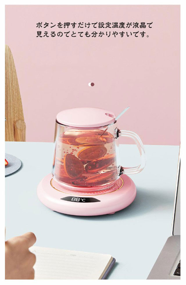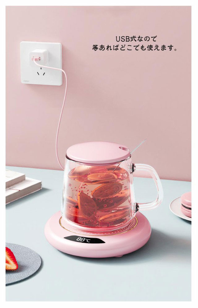 | 55℃、65℃、75℃と三段階の温度設定のできるカップウォーマーです。 USB式なので等あればどこでも使えます。 ガラス製、紙容器、プラスチック、ホーロー・陶磁器、パンやお菓子の保温にも使えます。 持ち運び可能な小型・軽量のシンプルタイプ。 ボタンを押すだけで設定温度が液晶で見えるのでとても分かりやすいです。 8時間経てば自動で電源が切れるのでうっかりさんも大丈夫! 55℃、65℃、75℃と切り替えスイッチで温度の調整ができます。もう一度押すと電源は切れます。 | |