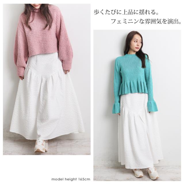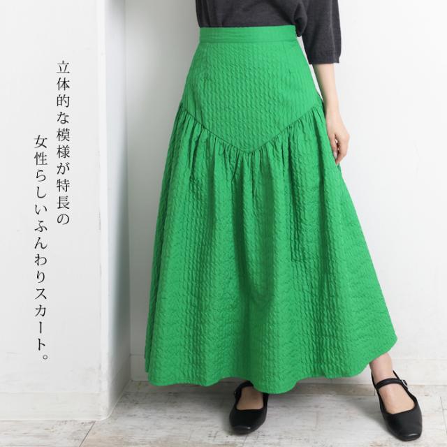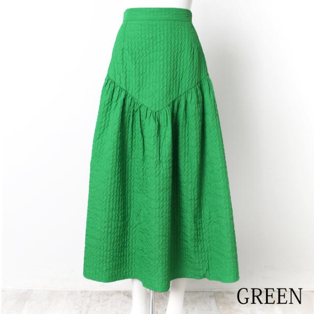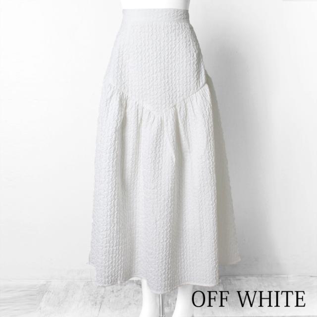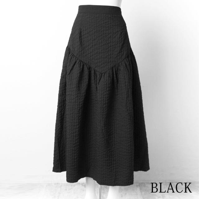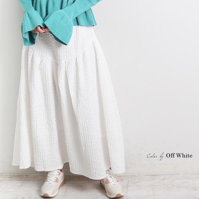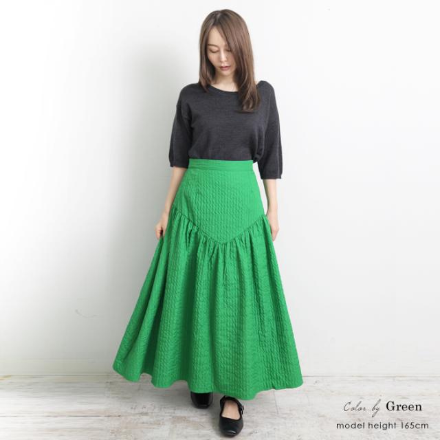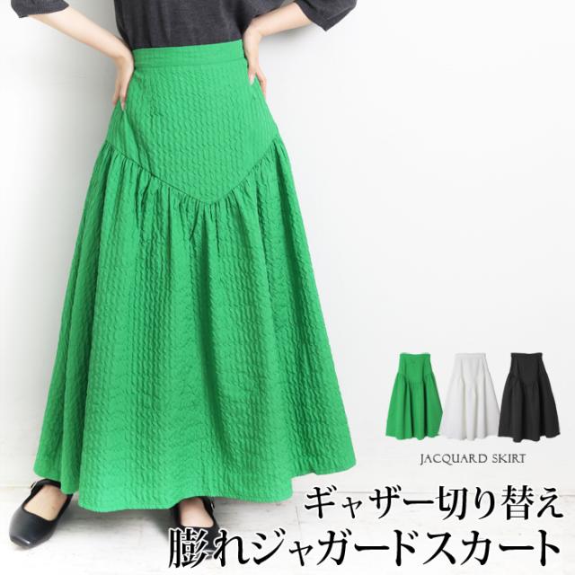ロングスカート レディース ジャガードスカート ロング丈 ブークレ ティアード 切り替え フレア 無地 ブラック グリーン オフホワイト[9754]