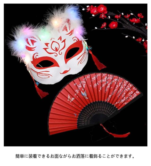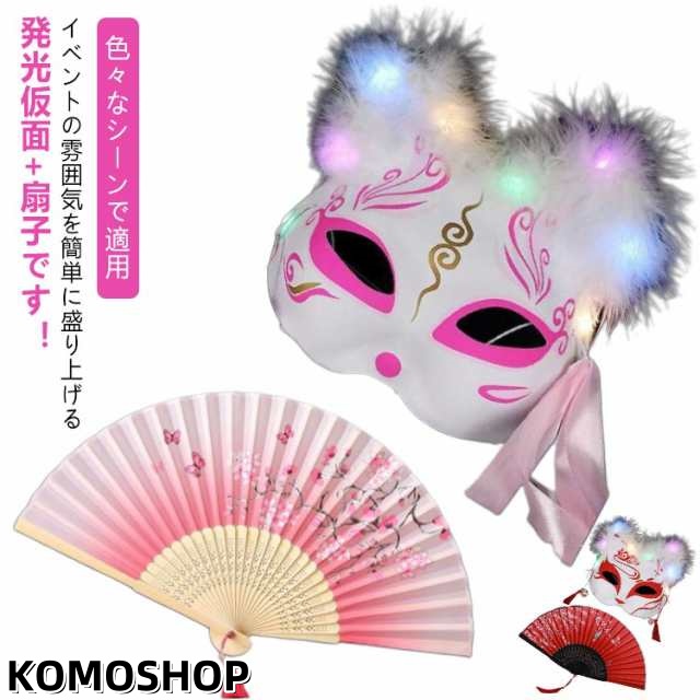 光る ハロウィン仮面 扇子 羽飾り付き キツネ仮面 妖怪マスク お面 覆面 和風 ダンスグッズ ダンス 個性派 舞踏会 忘年会 出し物 余興 舞台用 ハロウィン クリスマス コスプレ 仮装 変装 舞台 演出服 コスチューム 文化祭