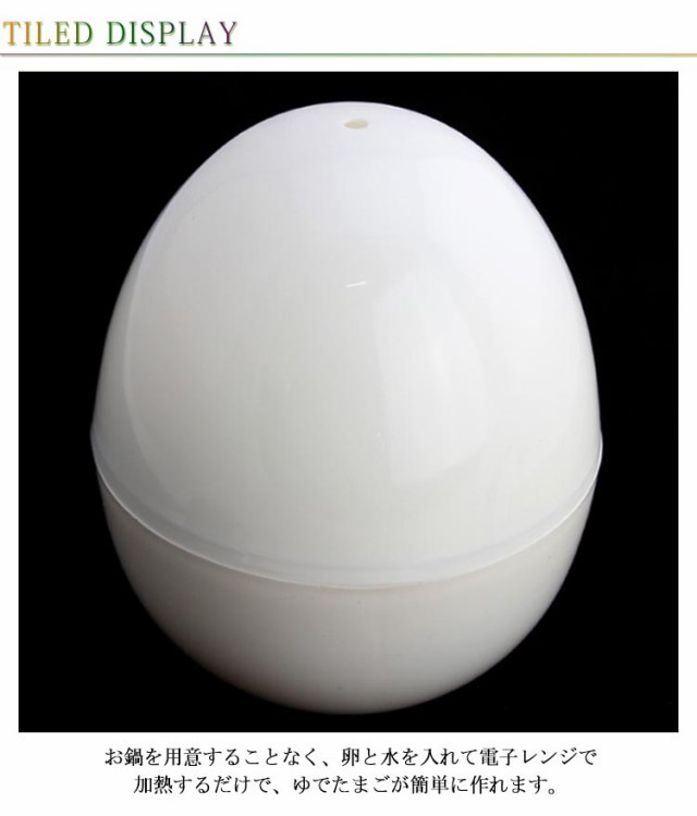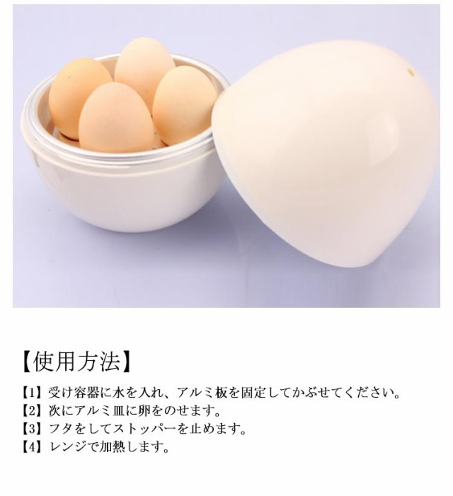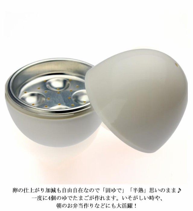 | ★お鍋を用意することなく、卵と水を入れて電子レンジで加熱するだけで、ゆでたまごが簡単に作れます。 ★卵の仕上がり加減も自由自在なので「固ゆで」「半熟」思いのまま♪ 一度に4個のゆでたまごが作れます。いそがしい時や、朝のお弁当作りなどにも大活躍! ★手軽に家族のために用意できる栄養たっぷりの卵とたっぷりの朝食で一日を元気にしてくれます。 ★【使用方法】 【1】受け容器に水を入れ、アルミ板を固定してかぶせてください。 【2】次にアルミ皿に卵をのせます。 【3】フタをしてストッパーを止めます。 【4】レンジで加熱します。 | |