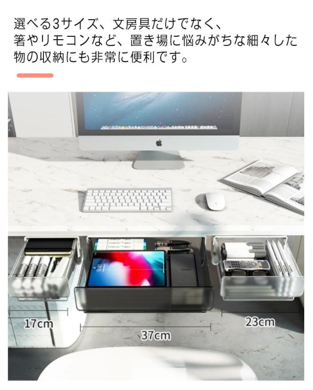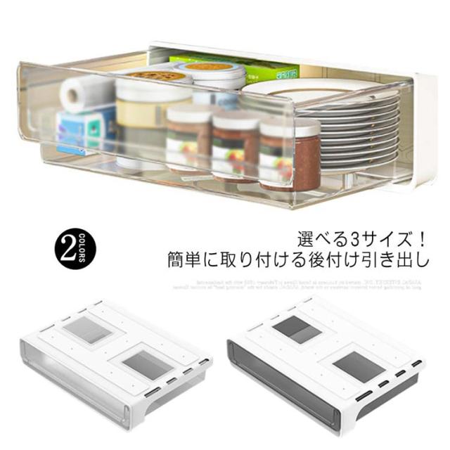 | 選べる3サイズ!簡単に取り付ける後付け引き出し 机の裏のデッドスペースを有効活用することで、いつもの散らかったデスク周りを整理できます。 出し入れスムーズで簡単に机上を片付けられて、仕事や勉強などの効率アップにつながります! 選べる3サイズ、文房具だけでなく、箸やリモコンなど、置き場に悩みがちな細々した物の収納にも非常に便利です。 付属のシールを裏面に貼るだけの簡単取り付け!粘着力の高いシールのため、落ちることなくしっかり固定されます。 耐荷重性抜群、厚めのシステム手帳を入れても落ちる心配はありません。 引っ掛けるタイプではないため机上にフックなどが出ず、シンプルなデザインと色合いでお部屋の景観を崩しません。 リビングはもちろん、キッチンやクローゼット、メイク台、書斎など様々なシーンでご使用いただけます。 | |