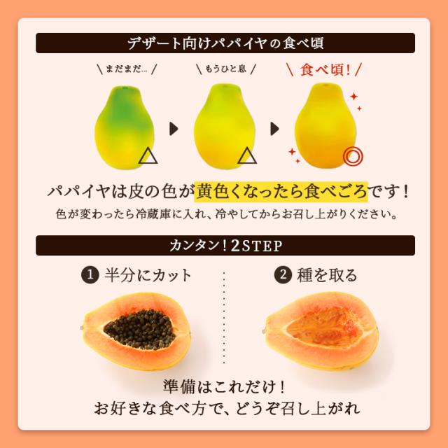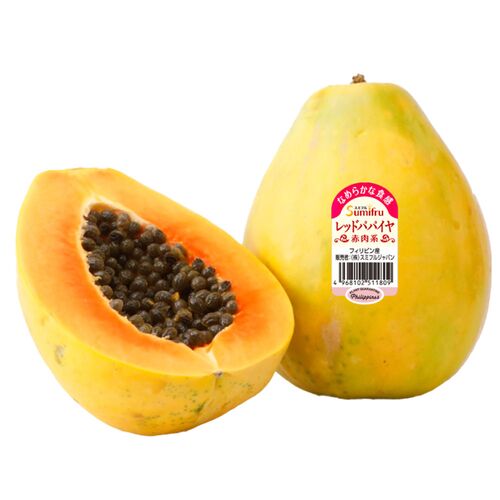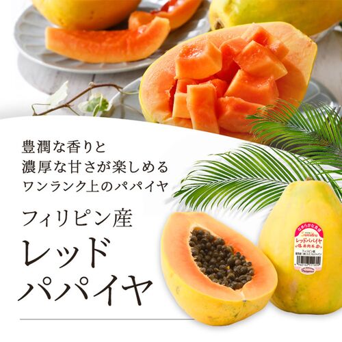 赤い果肉と濃厚な甘みが特徴。フィリピンで栽培されるカポホソロ種の亜種で、見た目はイエローパパイヤと同じです。豊潤な香り、とろける食感、濃厚な甘さが特徴でワンランク上の美味しさが味わえるパパイヤです。食べやすい美味しさです。色鮮やかで栄養価も高く、生食に加えてスムージーやデザートなど様々な方法でお召し上がりいただけます。特徴的な色合いと甘みは食卓を彩ります。