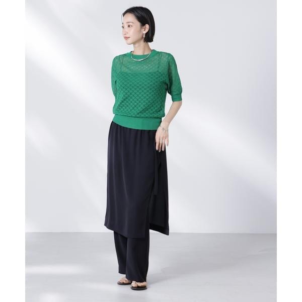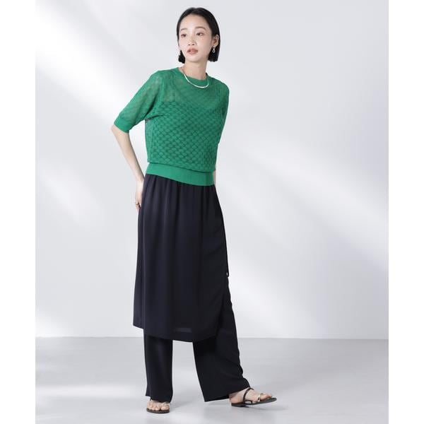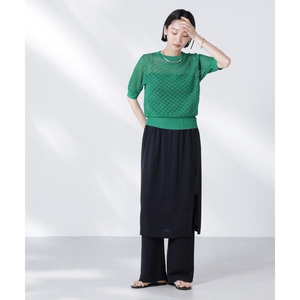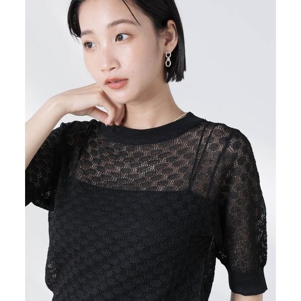 透け感のあるレース柄が女性らしさを惹き立ててくれる半袖ニット。インナーにキャミやタンクトップを合わせた清涼感のあるスタイリングがおすすめです。