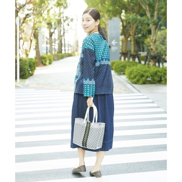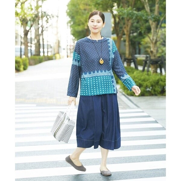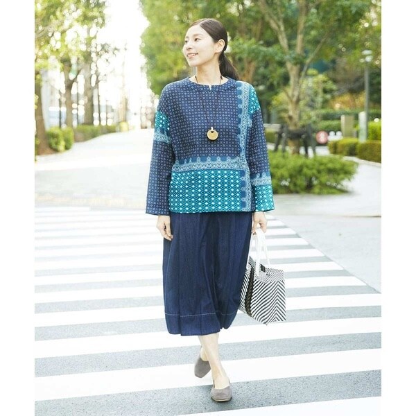 ジャンニロオリジナルの柄は、小付き柄と幾何柄をバンダナ風にアレンジして、パッチワークしているようなデザインに仕上げました。前身頃の中心にVの刻みの入ったクルーネックデザイン。後ろはボタン開きになっています。ややAラインのシルエットで、両サイドの裾にはスリットが入っているので、ボトムアウトしてもバランスがとりやすいシルエットに仕上げました。