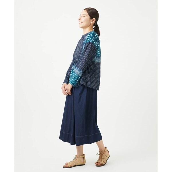 麻のようなシャリ感のあるポリエステル素材を、ブッチャー組織という粗めに織った素材です。その生地にオリジナルのバンダナ柄をパッチワーク風に表現して、贅沢にパネル送りでプリントした素材です。前身頃の裾にプリントされた柄が袖にも出てくる、これがこのバンダナ柄のパネル送りの特徴です。