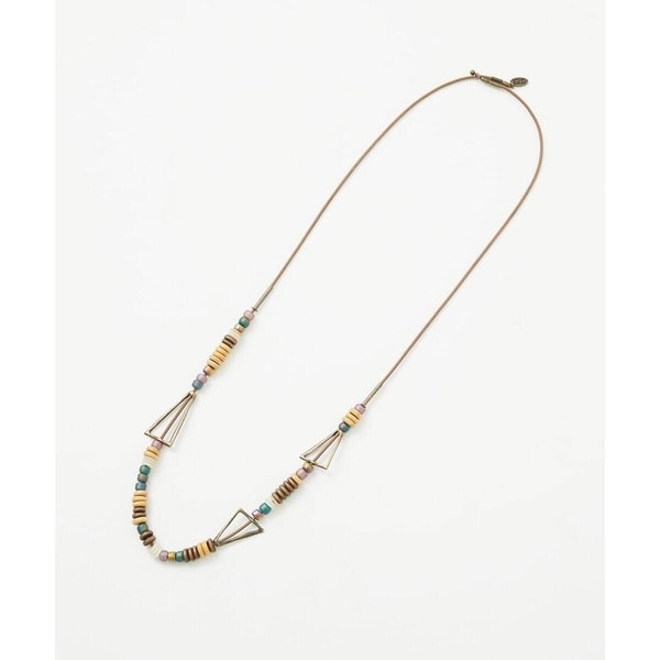 ナチュラル感のあるウッドビーズや光沢感を演出するガラスビーズを散りばめ、トライアングルモチーフがポイントのネックレスです。コーディネートを選ばず着用いただけるデザインで、ちょっとしたアクセントになってくれる使い勝手の良いアイテムです。