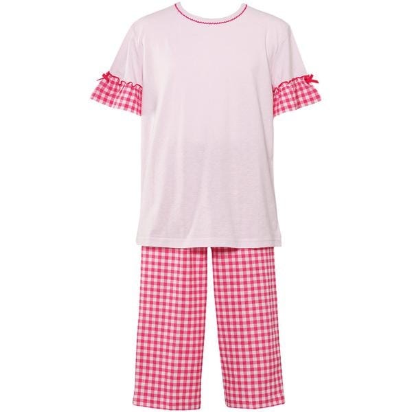【女児用パジャマ】トップス袖丈:半袖(3分袖)・ボトム脇丈:7分丈・かぶりタイプ●ギンガムチェック柄の袖フリルとボトムがカジュアルでかわいいパジャマ●トップスは無地でシンプルに表現し、ボトムのギンガムチェックで遊び心をプラス、袖にさりげなく付いたリボンもポイント●REカラーは元気なイメージ、KOカラーは落ち着いたイメージ、PUカラーはやさしいイメージを表現●本体に、やわらかく洗濯の取り扱いもしやすい、パジャマの定番素材である綿100%天竺素材を使用(30SZ綿天竺素材)・上下で別カラーの組み合わせ・肌側に名前が記入できるネーム付き・ボトムの前肌側にネームを付けることで、はく時に前後の目安になりやすい・ウエストゴム取り替え口あり※お洗濯は、必ず「取扱い表示」にしたがってください。