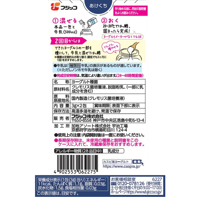 商品名 フジッコ カスピ海ヨーグルト 種菌 (3g×2個入) ×3個 容量 3g×2個×3個 原材料名 クレモリス菌培養液、脱脂粉乳(一部に乳成分を含む) アレルギー特定原材料 乳 賞味期限 商品の発送時点で、30日以上あるものをお届けいたします 保存方法 高温多湿を避け、常温で保存