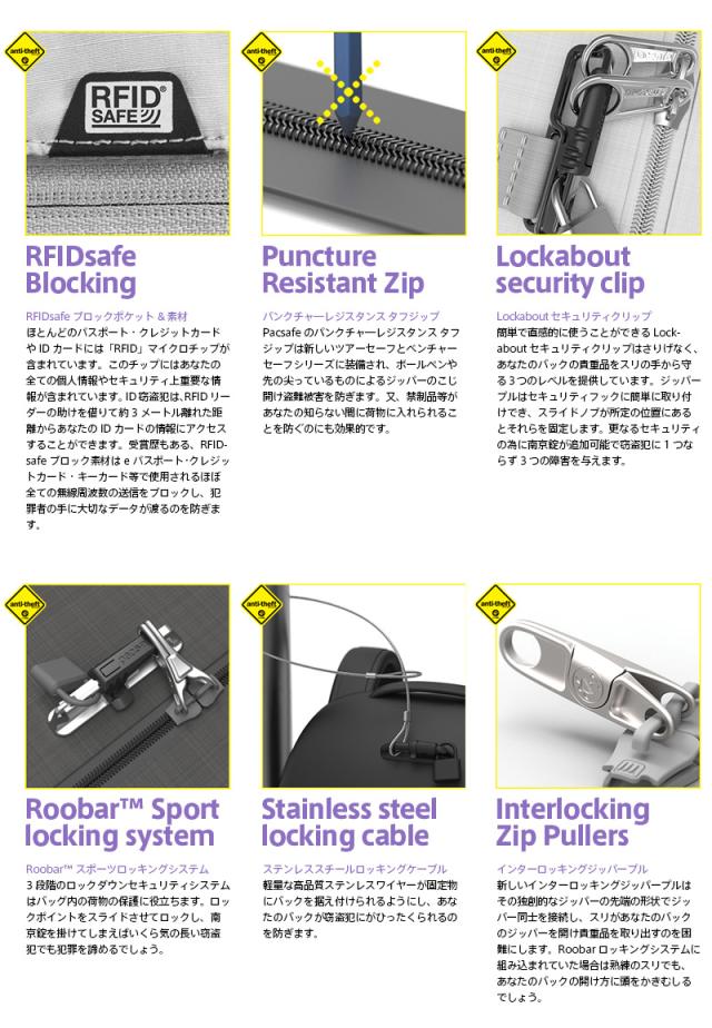 V26 ツアー バックパックはPacsafe独自のセキュリティ機能が満載で、日常から旅行まで対応可能なバックパックです。カットレジスタンスエキソメシュライニング、ロック可能なジッパー、RFIDブロックポケット、カットレジスタンスショルダーストラップなど、Pacsafeの代表的な盗難防止機能が搭載。スリの多い海外などでの旅行先で、貴重品や身分証明書などを安全に守ることができます。3つのロック可能なコンパートメントを備えており、16インチノートPCに対応したパッド入りスリーブ、バッグの中で無くしがちな鍵をセットできるキークリップ、メッシュポケット、ペンループ、クレジットカードや車のスマートキー等の情報を守るブロッキングテクノロジーを採用したギアポケットなどがあり荷物整理にも便利な仕様。