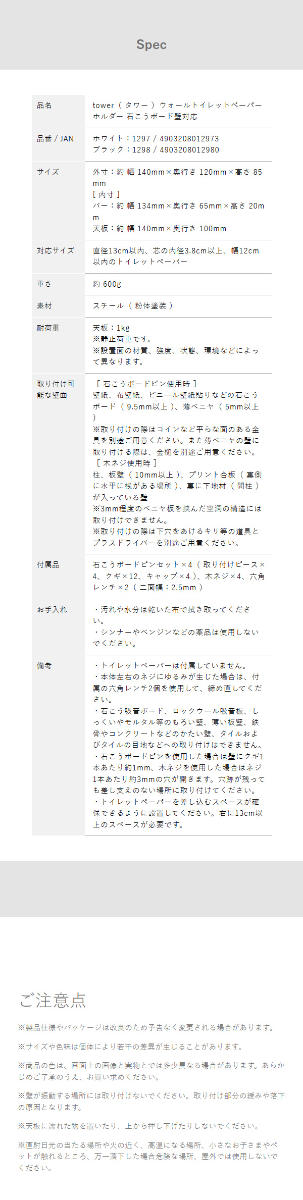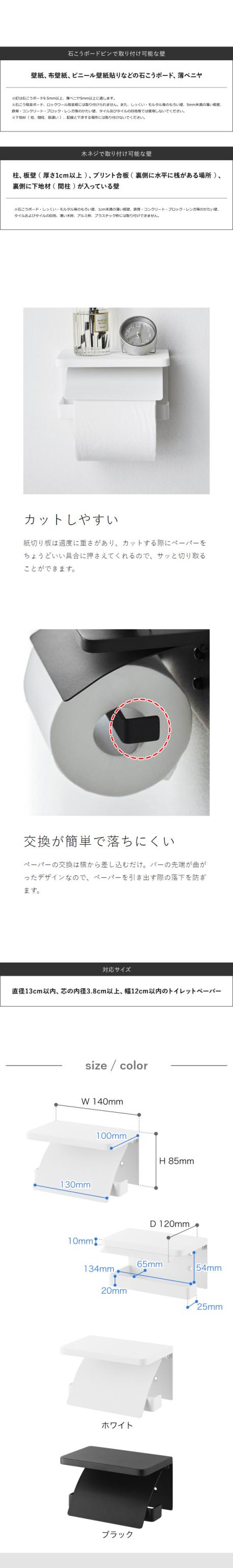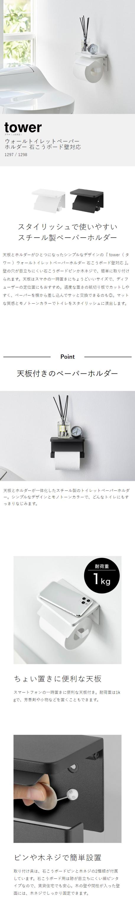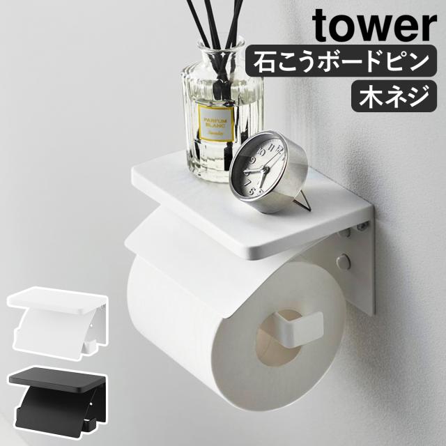 [ ウォールトイレットペーパーホルダー タワー 石こうボード壁対応 ]山崎実業 tower 1連 シングル ペーパーホルダー 石膏 壁面収納 壁掛け 木ネジ 飾り棚 棚付き カバー トイレ 賃貸 北欧 おしゃれ yamazaki 公式 モノトーン ブラック ホワイト 1297 1298