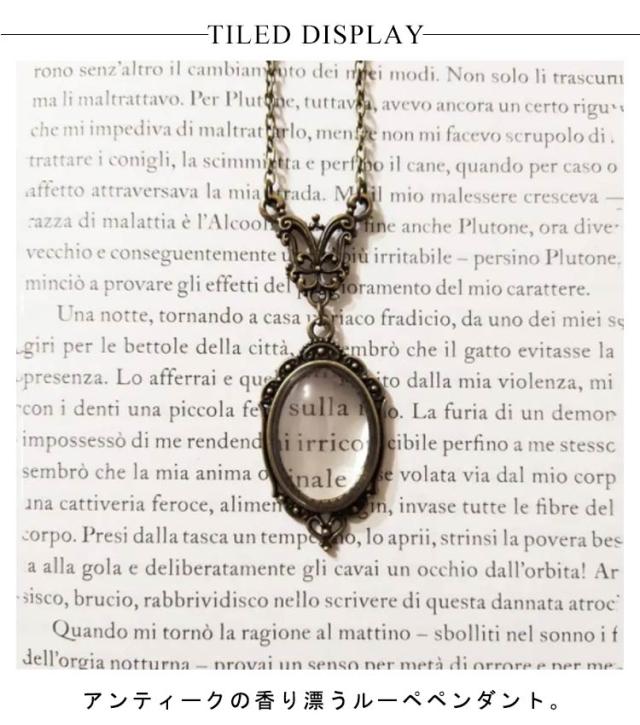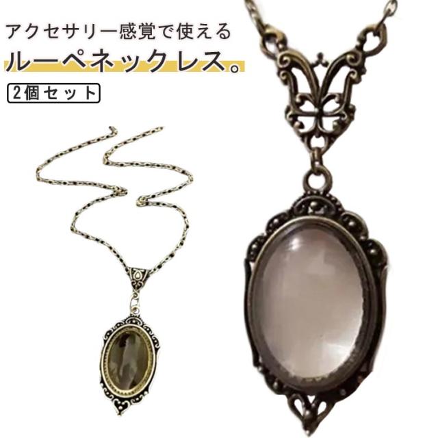 | アンティークの香り漂うルーペペンダント。 エレガントで華やかなルーペネックレス。 アクセサリー感覚で使えるルーペネックレス。 お出掛け先でちょっとした際に文字を拡大して使える便利なアイテムです。 アンティークジュエリーのような上質の作りで、品よく高級感があるので、ルーペは使わなくても、ペンダントで着けたくなるお品です。 嬉しい2個セットペンダントルーペ、装飾性と実用性に優れたデザイン、贈り物にもおすすめです。 | |