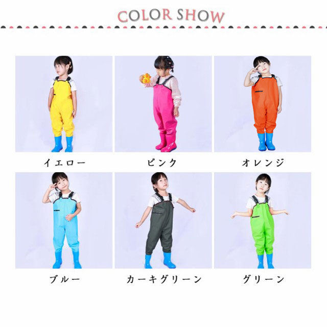 | 水遊び着用かわいいキッズ用ウェーダーです。【15.0cm−22.0cm】 全6色があって、男の子でも女の子でも使えます。 胴付き長靴で泥や水の侵入を防ぎ、安心してお子様が遊べます。 靴とズボンは熱溶着で接合しており、耐久性に優れます。また、丁寧な縫製により剛性に優れます。 防水生地、汚れに強い撥水加工され、防水効果を高いです。 幼稚園・保育園ではもちろん、通園などどんなシーンでも大活躍! | |