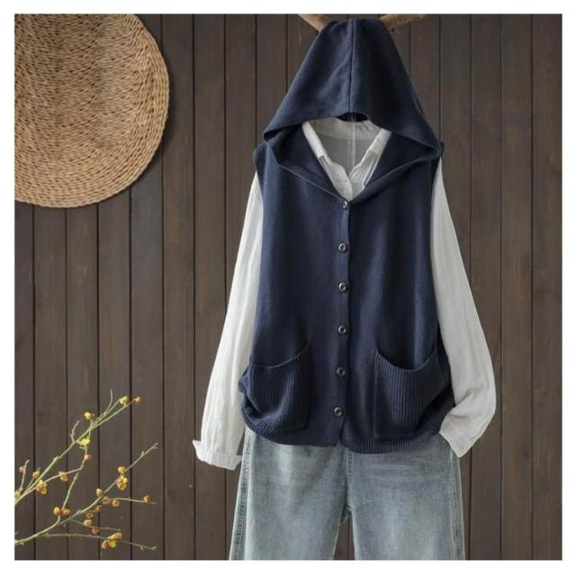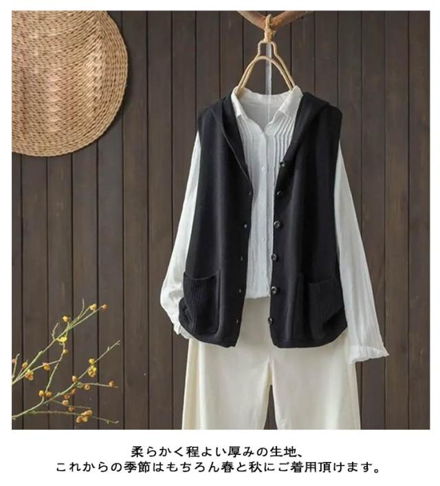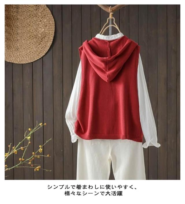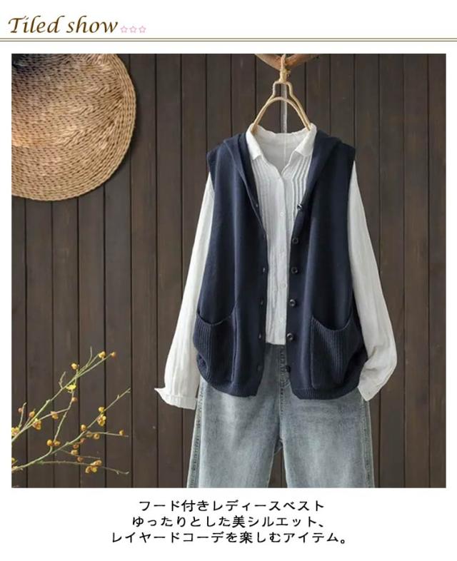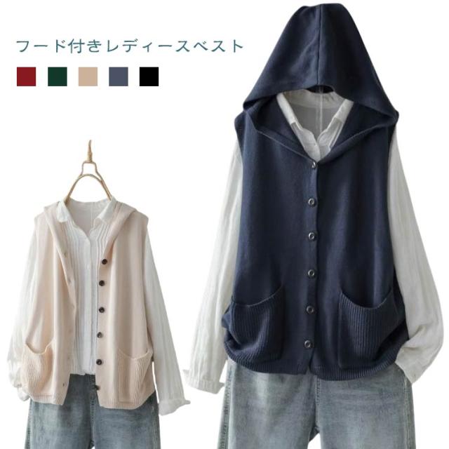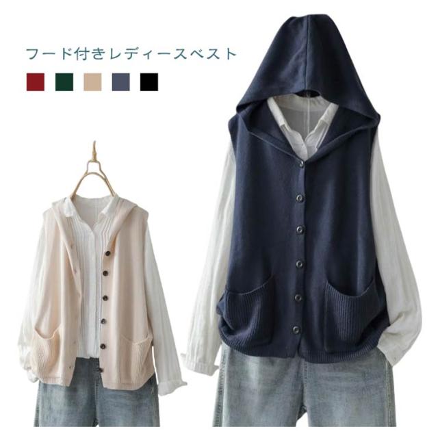ベスト ニットベスト 体型カバー フード付き レディース 前ボタン スウェット ジレ フレンチスリーブ 大きいサイズ 韓国 トップス おしゃれ 無地