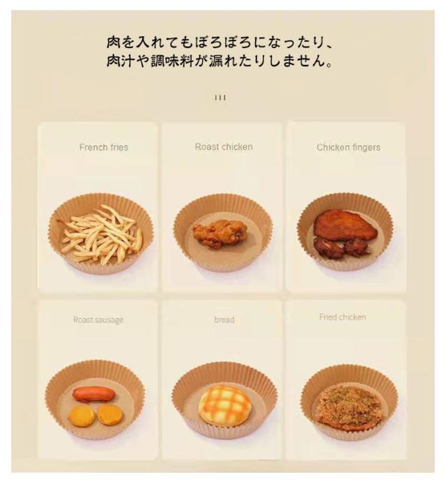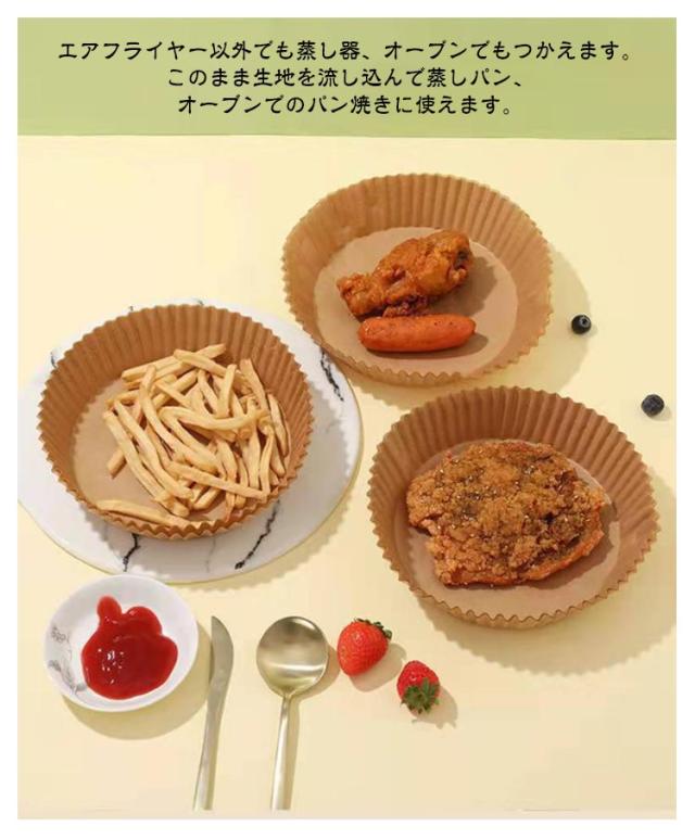 | 200枚入り お菓子 5-10L適用 スクエア型 / 円型 食品グレードの高級パーチメント紙を使用し、防水性、耐油性、耐熱性に優れています。 肉を入れてもぼろぼろになったり、肉汁や調味料が漏れたりしません。 220℃までの高温に適用しています。 空気の循環でライナーが持ち上がり、加熱コイルに接触する可能性があります。 エアフライヤー以外でも蒸し器、オーブンでもつかえます。 このまま生地を流し込んで蒸しパン、オーブンでのパン焼きに使えます。 また、電子レンジで、冷凍ものや揚げ物の温め直しに便利です。 | |