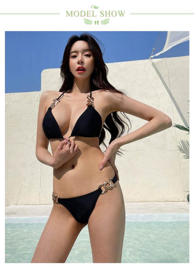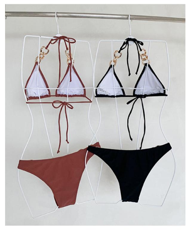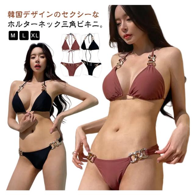 水着 チェーン ホルターネック ゴールド 韓国 三角ビキニ ビキニ 大人 異素材 セクシー ブラジリアン アクセサリー 無地 ノンワイヤー おしゃれ オトナ女子 プチプラ 海 水着 黒 ブラック テラコッタ 20代