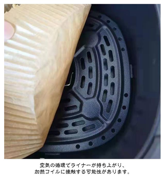 | 200枚入り お菓子 5-10L適用 スクエア型 / 円型 食品グレードの高級パーチメント紙を使用し、防水性、耐油性、耐熱性に優れています。 肉を入れてもぼろぼろになったり、肉汁や調味料が漏れたりしません。 220℃までの高温に適用しています。 空気の循環でライナーが持ち上がり、加熱コイルに接触する可能性があります。 エアフライヤー以外でも蒸し器、オーブンでもつかえます。 このまま生地を流し込んで蒸しパン、オーブンでのパン焼きに使えます。 また、電子レンジで、冷凍ものや揚げ物の温め直しに便利です。 | |