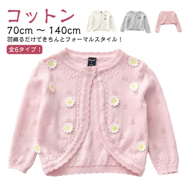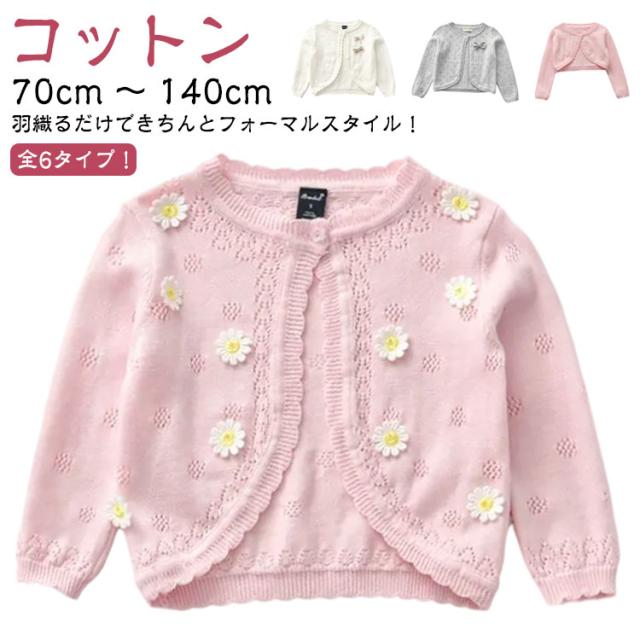 | 70cm 〜 140cm コットン 全6タイプ! 羽織るだけできちんとフォーマルスタイル! 結婚式のお呼ばれの室内着、 肌寒い時やお出かけ時に1枚持ってると便利♪ 女の子の可愛さを引き立たせてくれるとっても可愛いデザイン! 朝晩の急な冷え込みや、結婚式場の冷房のきいたお部屋で過ごす時に、 日焼け防止にもお役立てください。 大活躍してくれるカーディガンはマストアイテムです!! | |