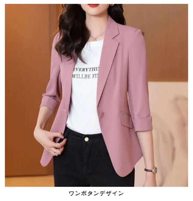 | 七分袖スーツジャケット ワンボタンデザイン 薄手で、春夏に最適です。日焼け止めや冷房対策にも スリムなシルエットで、通勤にも普段使いにも最適です。 6色展開で、様々なコーディネートに合わせられます。 | |