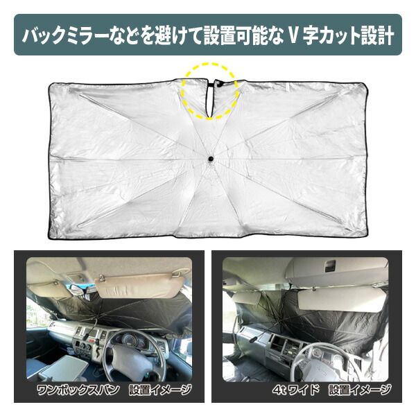 | 商品説明 | ●大型フロントガラスをしっかりカバーするスーパーワイドサイズ ●遮光61%、遮光/UVカット99.9%以上 ●ご使用目安:大型バン・ハイエース〜2tトラック ●バックミラーなどを避けやすいV字カット ●シャフトは曲げることが出来るのでカーナビ、ダッシュボードなど車を傷付けないよう設置可能 ●車を傷付けにくいやわらかグリップを採用 ●専用収納ケース付き |