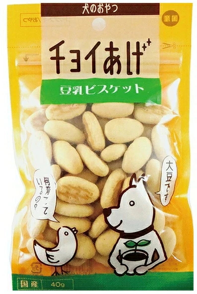 4532066003863チョイあげ豆乳ビスケットは、豆乳を使用した、ひと口サイズの国内産のビスケットです。しっとりとした食感でお口の中でサッととけるので、超小型・小型犬でも美味しく食べれます。嗜好性も高いので、お散歩のおともに、またご褒美としてお使いいただけます。