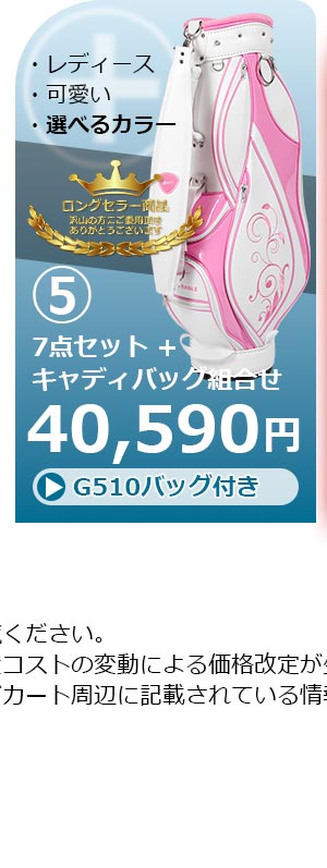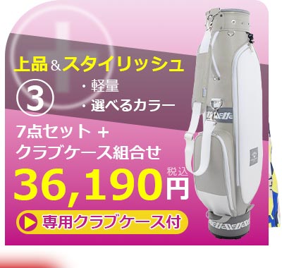 初心者のみなさまへ。ゴルフを始めたい女性へ。実用性がありスタイリッシュ。しかも始めやすい価格。クラブ6本にヘッドカバー1個、キャディバッグの8点ハーフセット。カラーはホワイトソーダとブラックプラムからお好きな色を選べます。